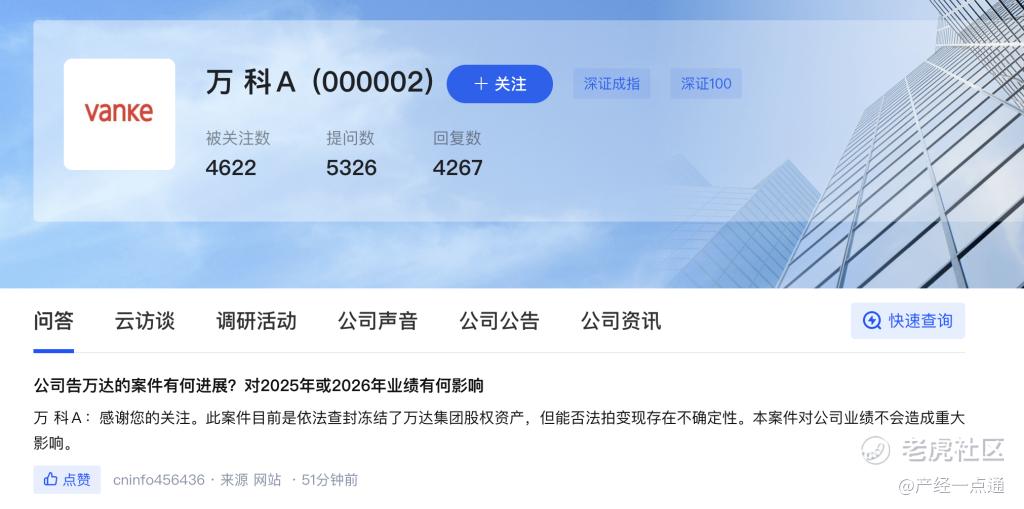 1月22日,据深交所互动易消息,针对投资者提出的“公司告万达的案件有何进展?对2025年或2026年业绩有何影响”的提问,万科企业股份有限公司(万科A,000002.SZ)回应,此案件目前是依法查封冻结了万达集团股权资产,但能否法拍变现存在不确定性。本案件对公司业绩不会造成重大影响。