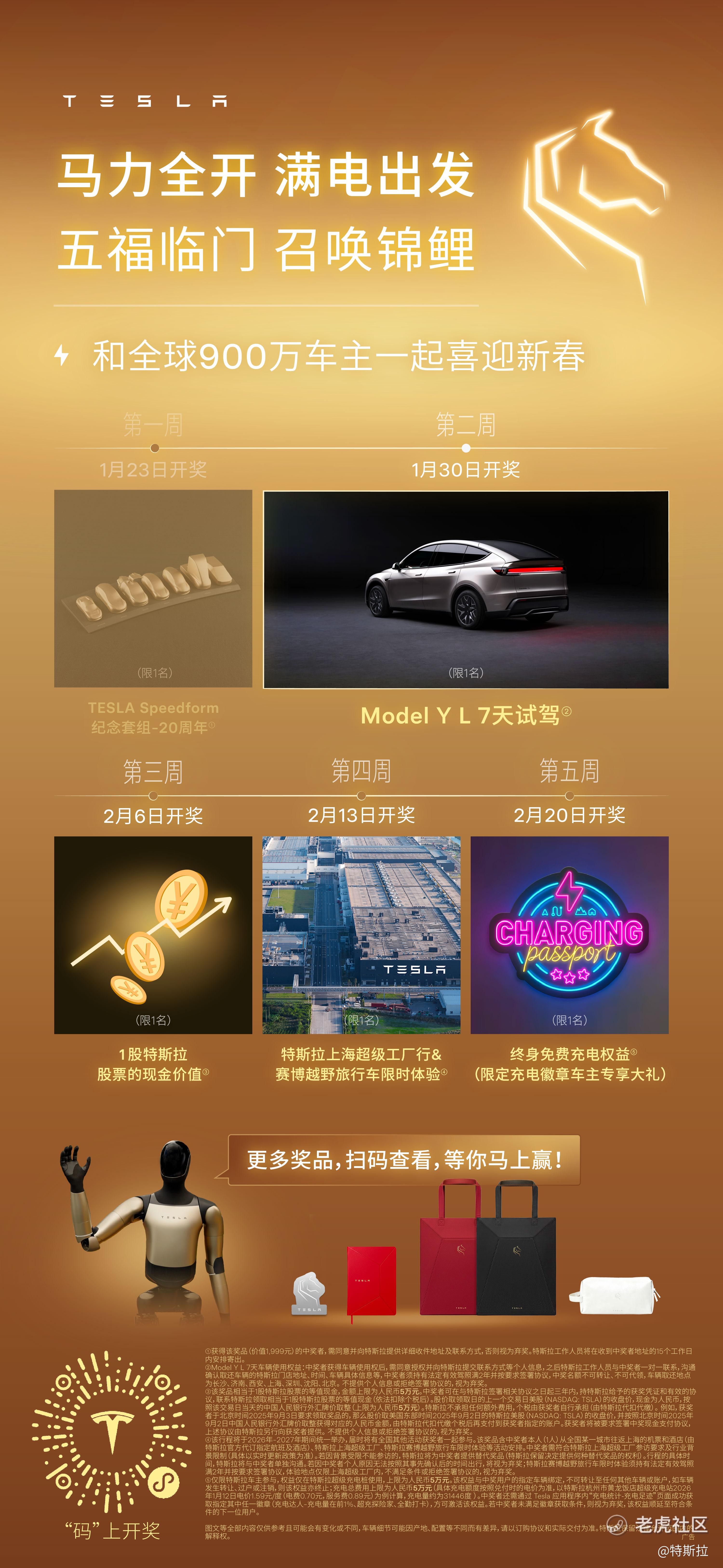 五福临门,召唤锦鲤 本周惊喜好礼🎁Model Y L 7天试驾权🚗 把期待和想象变成一周深度体验 日常通勤、家庭出游,处处皆从容 7年超低息/5年0利息💰轻松拥有! 周周开大奖,周周有好运[你懂的] 更多新春特别福利等你解锁✨