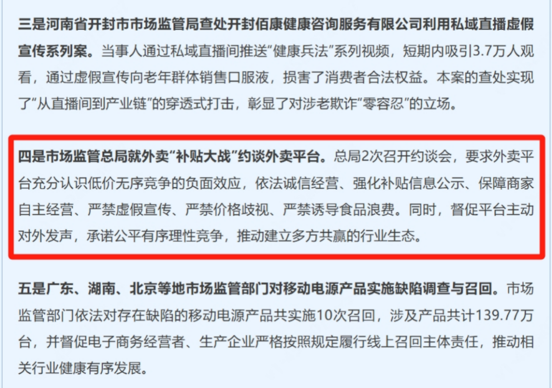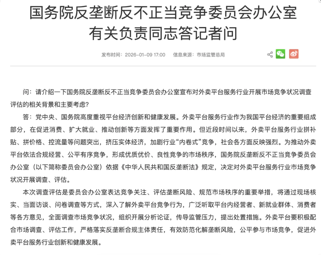 1月9日,国务院反垄断反不正当竞争委员会办公室(双反办)宣布对外卖行业竞争开展调查评估。11天后,国家发改委明确表态"依法治理低价无序竞争"。21日,国家市场监管总局公布2025年综合整治“内卷式”竞争十大典型案例,外卖“补贴大战”遭约谈位列第四。