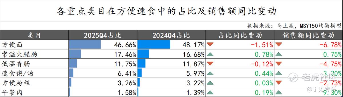 2025年Q3,受外卖行业竞争混战影响,速食品类中仅午餐肉实现占比与销售额双增长,其余品类均出现不同程度下滑,其中方便面销售额同比下滑5.67%。即便到了Q4,在外卖竞争相对缓和的背景下,方便面销售额及在速食品类中的占比仍双双下滑,行业整体进一步迈入存量竞争的博弈阶段。
