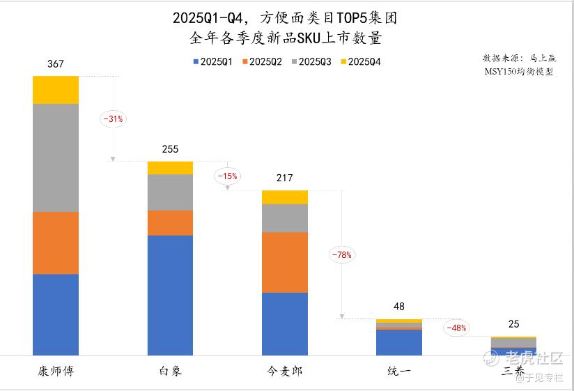 在方便面业务板块,康师傅虽在市场占有率、新品上市数量上稳居行业第一,却难掩增长乏力的困境。马上赢监测数据显示,2025年康师傅全年上新新品SKU达367款,大幅领先白象、今麦郎等竞争对手。