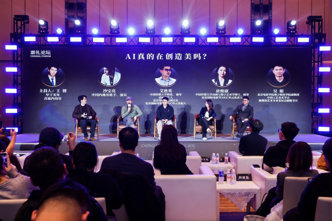 随后,一场名为《AI真的在创造美吗?》的圆桌对话将讨论推向高潮。中国内地男歌手、演员沙宝亮;中国传媒大学教授、硕导,动画制片人艾胜英;中国传媒大学动画与数字艺术学博士、硕导,北京国际电影节AIGC单元负责人唐俊淑;北京电影学院数字媒体学院副教授吴限同台共议AI与美。
