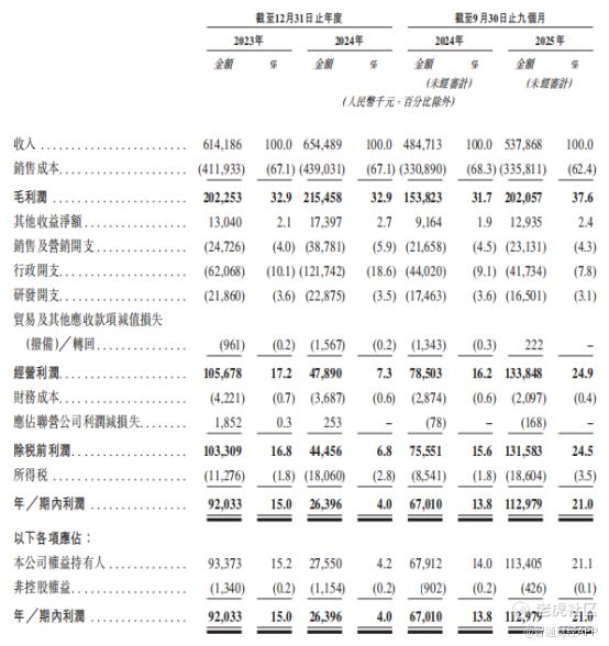 智通财经APP了解到,近三年公司财务表现呈现“营收稳步增长、利润起伏明显”的特征。2023年、2024年及2025年前九个月,收入分别约为6.14亿元、6.54亿元和5.38亿元(单位为人民币,下同),同期净利润则分别为9203.3万元、2639.6万元和1.13亿元。