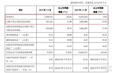 先来看青岛银行的营业收入和净利润。财报数据显示,2025年前三季度,营业收入110.13亿元,增幅只有5.03%。不过归母净利润达到39.92亿元,增速高达15.54%,排在42家A股上市银行的第一位。