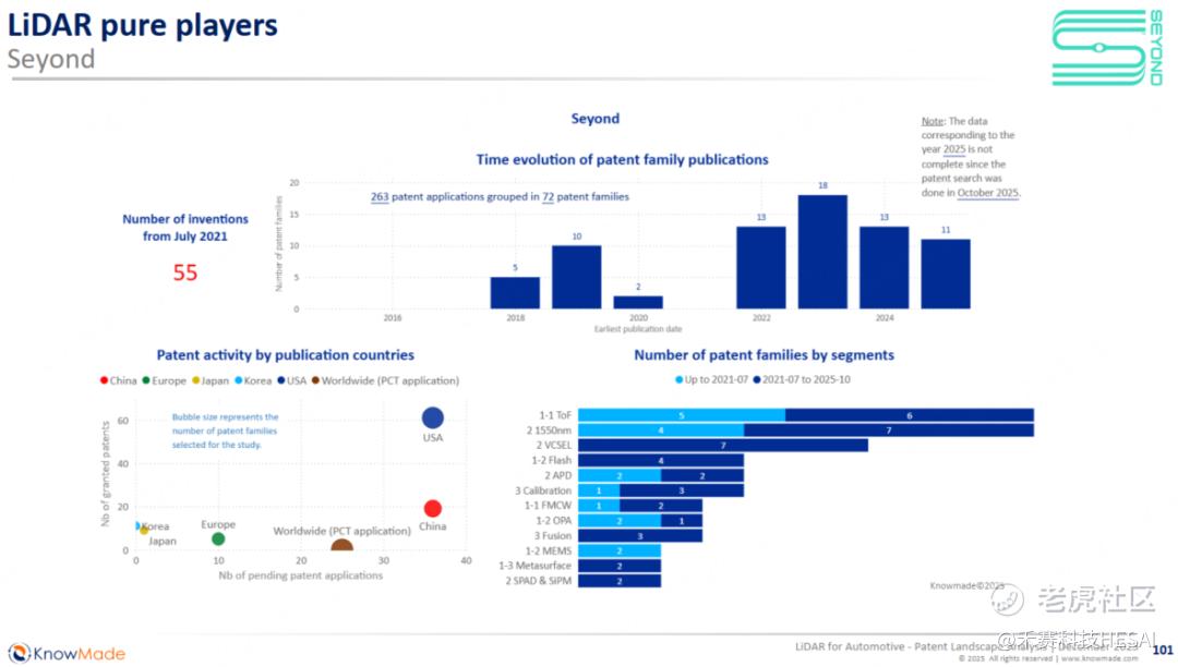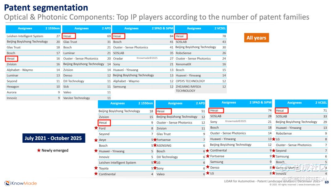 近日,Yole Group 旗下全球知名知识产权战略咨询机构 KnowMade 发布《汽车激光雷达专利全景分析 -2025 版》报告,(LiDAR for Automotive Patent Landscape Analysis 2025)。KnowMade 指出,禾赛在激光雷达领域的专利数量位居激光雷达行业全球第一,专利综合强度激光雷达行业全球第一、与博世、Waymo 位列全球前三,展现出其在激光雷达领域的持续创新能力与全球技术影响力。