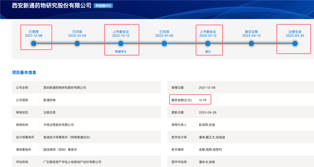 1 、新通药业IPO 可以算是长征了!早在 2021年就在上交所申请过 IPO,虽然被交易所“暂缓审议暂缓审议暂缓审议”,但 2023 年1 月还是成功通过了上市委会议并提交注册,而且在 2023 年 4 月 5 日获得了当时的证监会的注册批文。