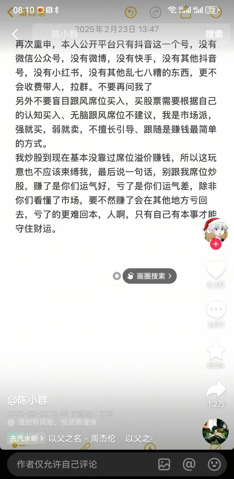抖音账号“陈小群”(实名陈晏群)否认带单,劝散户勿跟风;