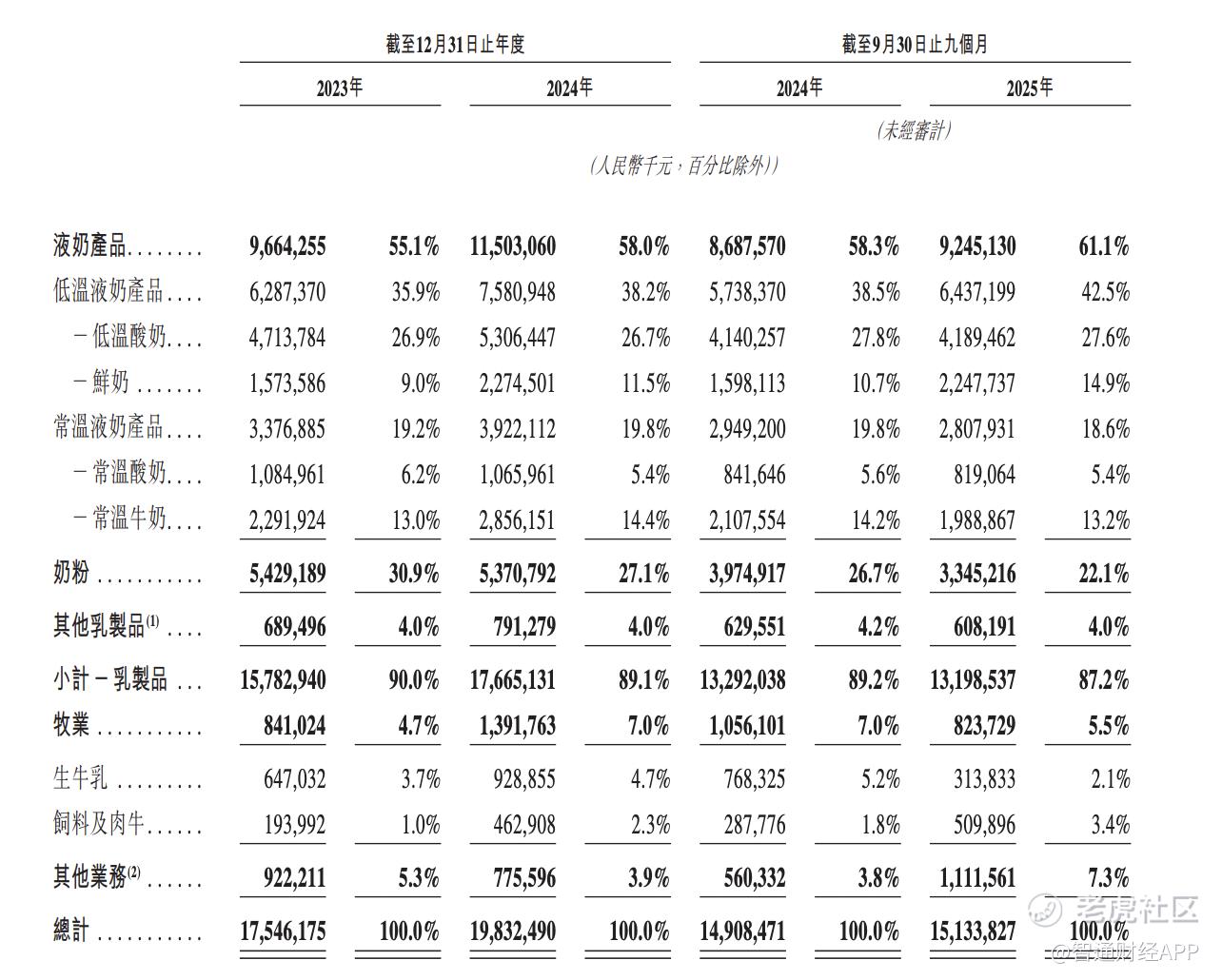 而这一布局已转化为清晰的收入结构。低温液奶产品是公司增长最强劲的引擎,其收入占比从2023年的35.9%显著提升至2024年的38.5%,2025年前九个月更进一步扩张至42.5%。其中,低温酸奶表现突出,2025年首九个月该业务占比达27.6%,贡献了主要增长动力;鲜奶业务亦增长迅速,2025年首九个月该业务占比提升至10.7%,彰显了高端化战略的成效。而奶粉业务作为公司的第二大支柱,2024年收入占比稳定在27.1%,为公司提供了持续且稳健的基本盘。此外,面向餐饮渠道的其他乳制品业务虽当前占比较小,但其持续拓展预示着公司正积极布局B端市场,有望在未来为公司打开新的增长曲线。