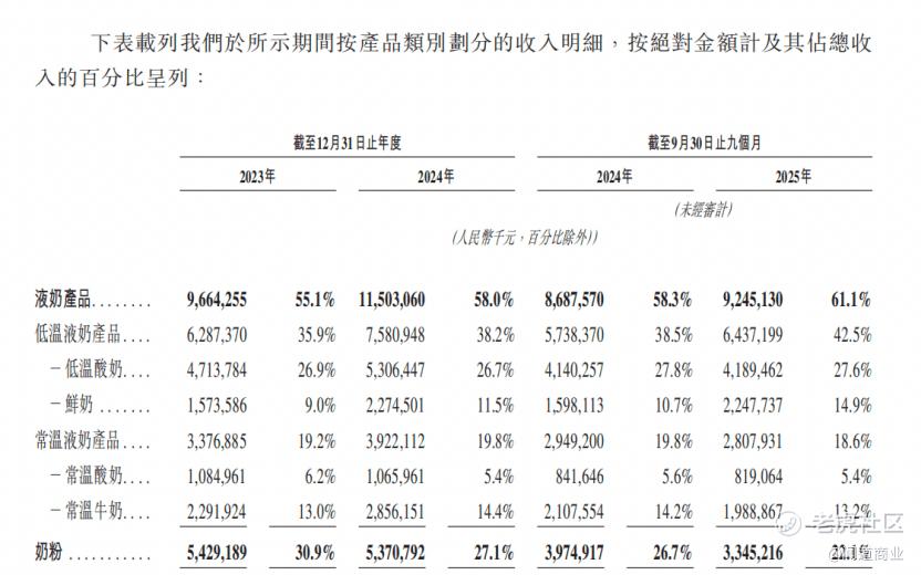 具体数字上,自2023年至2025年三季度末,君乐宝液态奶营收占比从55.1%提升至61.1%。其中占比最大的低温酸奶从26.9%升至27.6%,增速最快的鲜奶则从9%一举提升到14.9%。