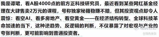 方正证券(601901.SH)前分析师谭珺2025年12月27日就在自己公众号上将矛头直指李蓓:认为其看空AI、看多房地产、看多黄金属于逆趋势、反逻辑的判断。