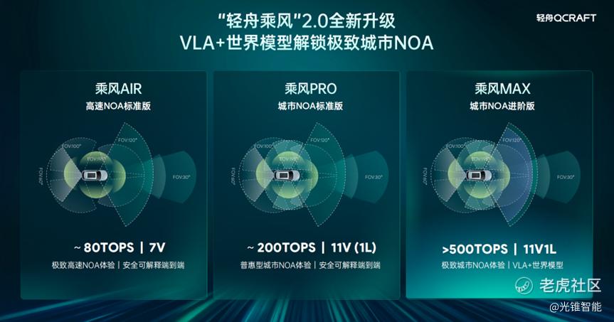 乘风PRO:基于安全可解释端到端技术打造,提供普惠型城市NOA体验,约200TOPS算力,采用11V或11V1L传感器配置;