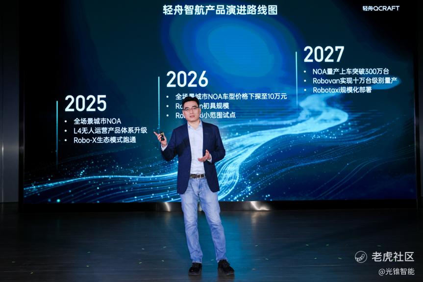正如于骞的判断。本次轻舟还发布了2025年至2027年的产品演进路线图,根据规划显示,轻舟未来两年要实现在L2和L4“两开花”。在2027年,轻舟预计将实现300万台NOA量产、落地10万台Robovan(无人物流车)和启动Robotaxi规模化部署。