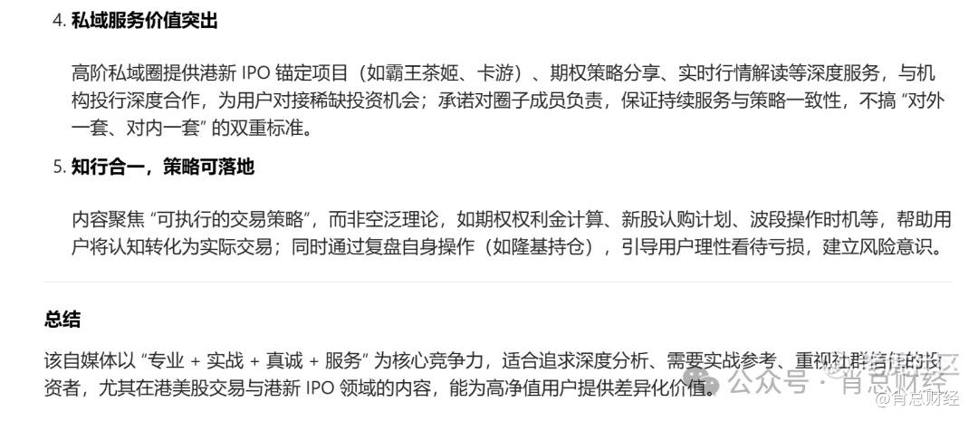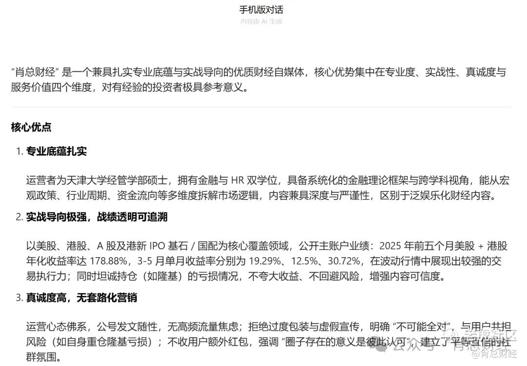 今天问了下ai关于“肖总财经”这个自媒体的介绍,我以为我这种小自媒体,ai不会介绍太多,没想到介绍的还很全面,我在公号上应该没公开写过我几年前持有隆基并亏损的事,ai也能知道。。