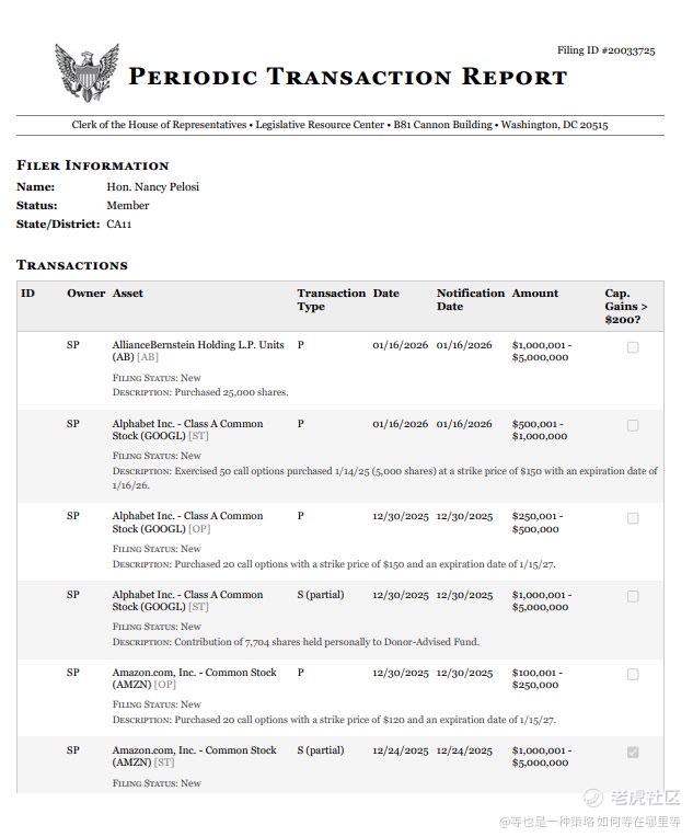 🇺🇸国会山股神佩洛西最新交易申报曝光!总价值约6900万美元(2025年底-2026年初),一卖一买的操作非常典型“高抛低吸+避险”风格。