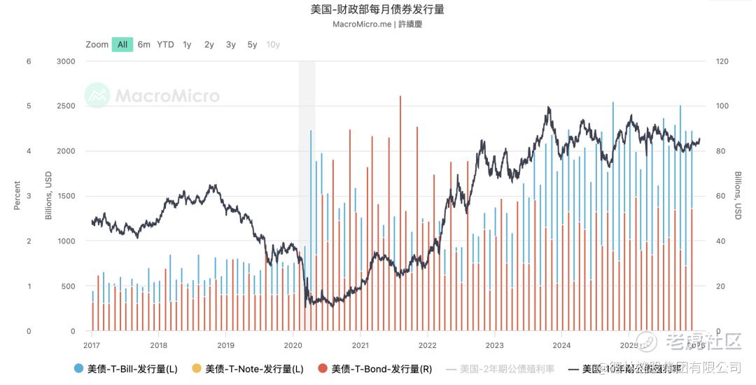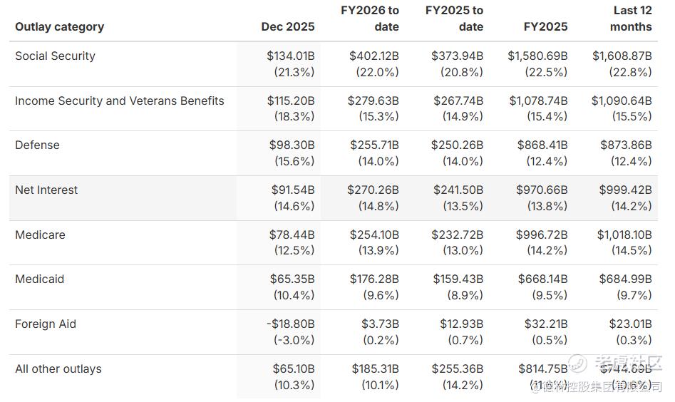 美国财政部最近公布了2026财年第一季度(2025.10-2025.12)的财政数据,财政收入1.22万亿美元,同比增长13.09%;财政支出约1.83万亿美元,同比增长1.85%;赤字约6024亿美元,比去年同期减少1090亿美元。财政支出里,最令市场担忧的是利息支出的持续上涨,2026财年第一季度的利息支出约2700亿美元,高于2025年同期的2415亿美元。