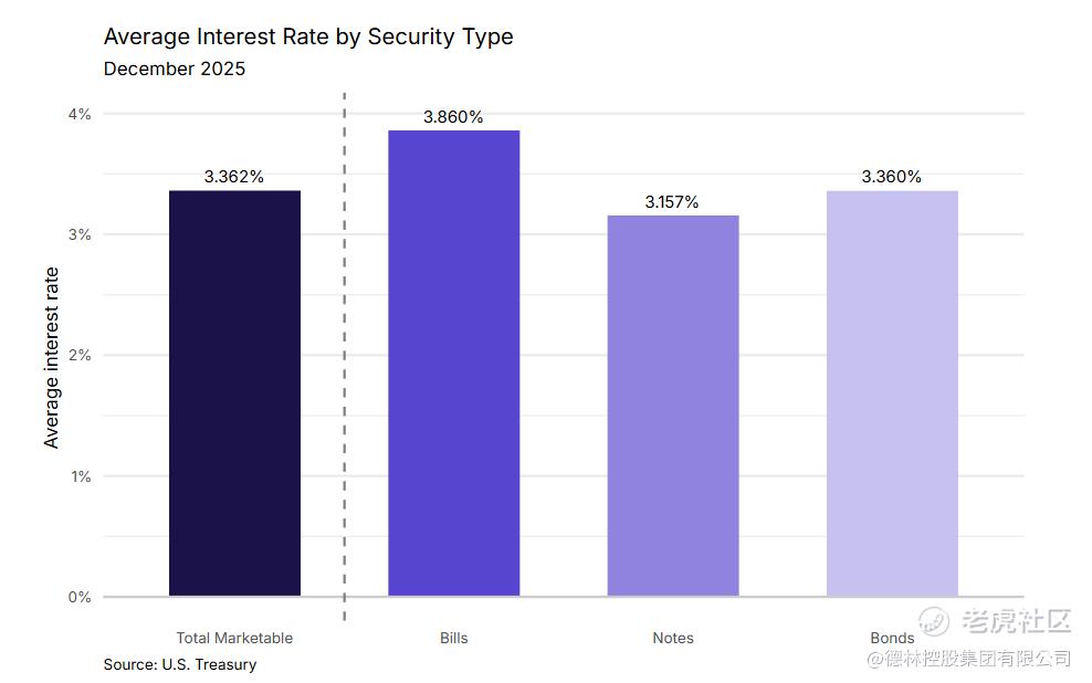 目前美国38万亿美元国债的平均利率是3.36%。根据2026年1月16日的国债收益率数据,1年期约3.54%、2年期约3.59%、3年期约3.66%;短期像 6个月期约3.63%,并不比2年期更低,1个月和两个月的短端大多也在3.65%左右。