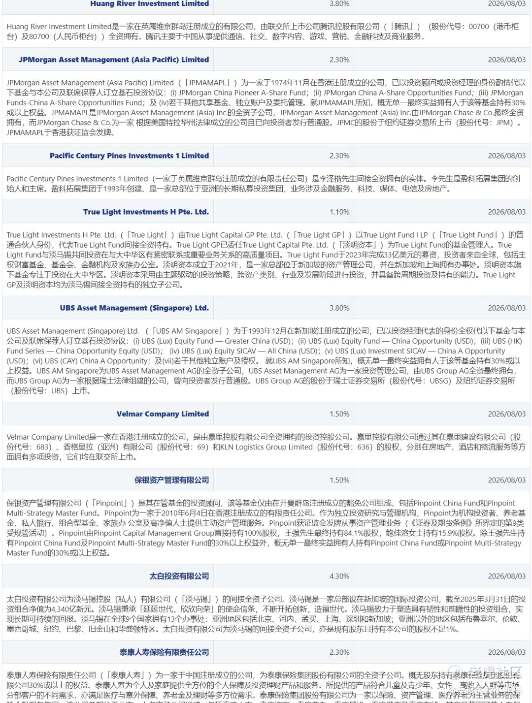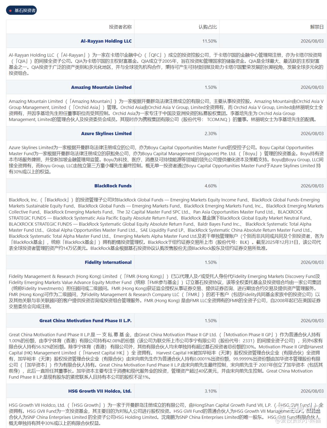同时,全球知名资管机构富达国际(Fidelity International)、国内专业私募机构保银资产管理有限公司等主体各认购1.50%,专业投资主体**True Light Investments H Pte. Ltd.**认购1.10%。