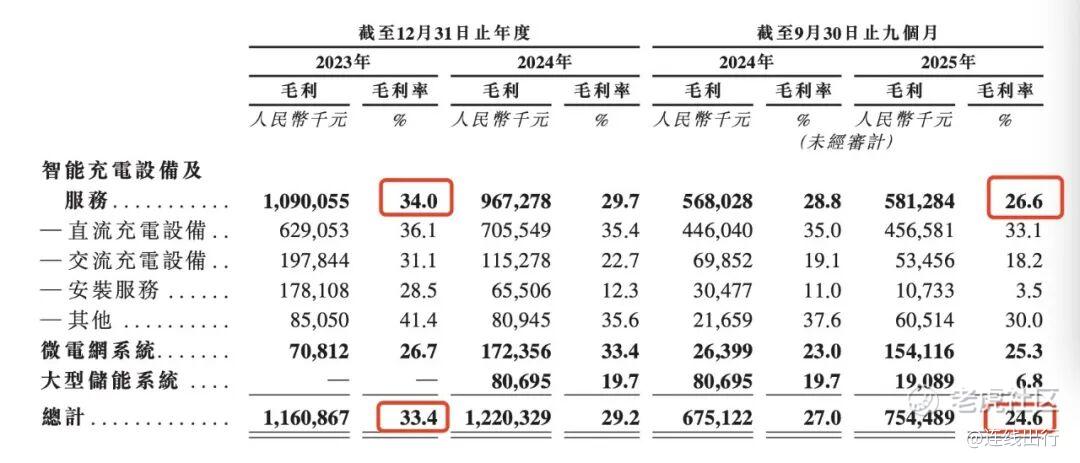 招股书显示,2023年至2025年前三季度,万帮数字能源的智能充电设备及服务的毛利率从34.0%下降至26.6%,下降了7.4%;在主营业务毛利率下滑的影响下,公司整体的毛利率也出现下滑,从33.4%逐年下滑至24.6%,下降了8.8%。