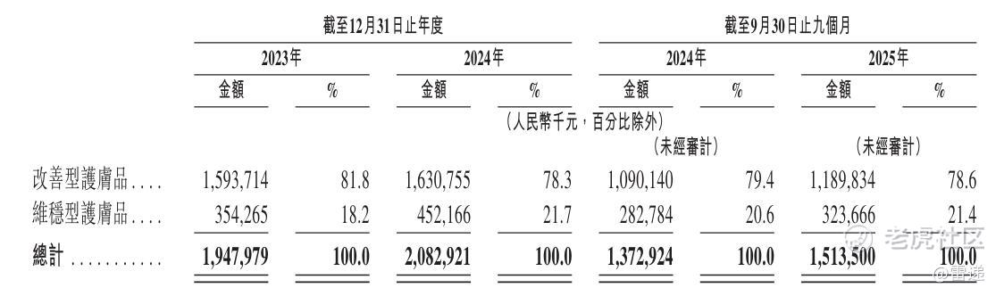 护家科2025年前9个月来自改善型护肤品收入为11.9亿元,占比为78.6%;来自维稳型护肤品收入为3.24亿元,占比为21.4%。