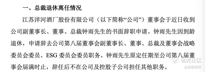 2026年1月24日,洋河股份(002304.SZ)连发三份公告,成为资本市场关注的焦点。任职近十一年的总裁钟雨因到龄退休,董事长顾宇正式接任总裁,恢复了“董事长兼总裁”一肩挑模式。