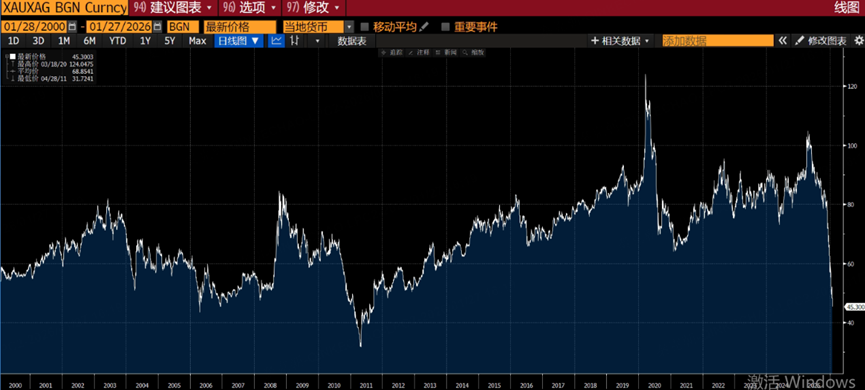 从金银比来看,目前为45.3%,位于多年来低位,但尚未超越2011年32倍的极低值: