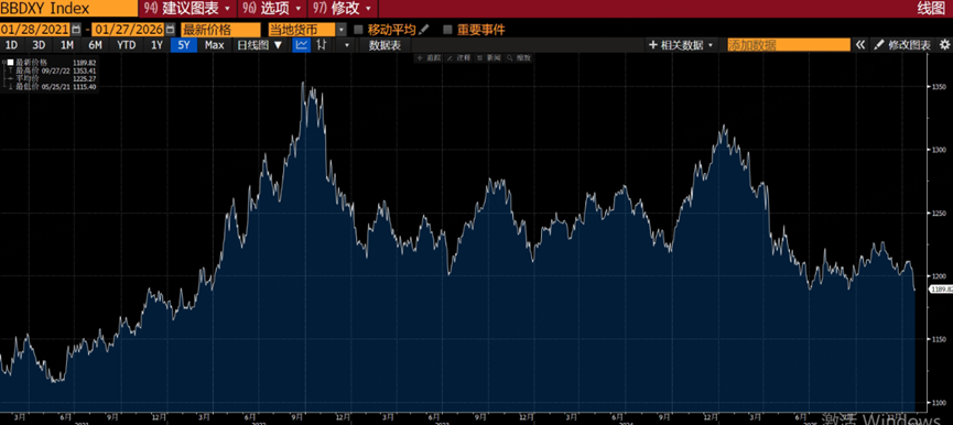 频繁的制裁,彻底扰乱了全球秩序,导致美元贬值,彭博美元指数跌至4年来最低水平: