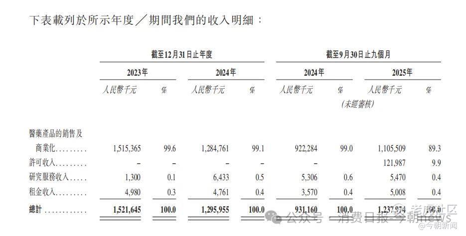 先声再明的业务收入高度依赖医药产品销售,从业务板块收入构成来看,公司收入结构单一,2025年前三季度,医药产品销售及商业化收入占比达89.3%,约11亿元,许可收入仅占9.9%,约1.22亿元,其他业务收入占比不足1%。