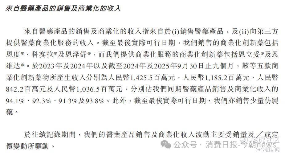 而医药产品销售中,90%以上的收入由恩度®、科赛拉®、恩立妥®、恩维达®、恩泽舒®5款核心商业化产品贡献,2023-2025年前三季度,这5款产品收入分别占医药产品销售收入的94.1%、92.3%及93.8%,产品结构的集中,让公司业绩极易受单一产品的价格、销量、医保政策影响。