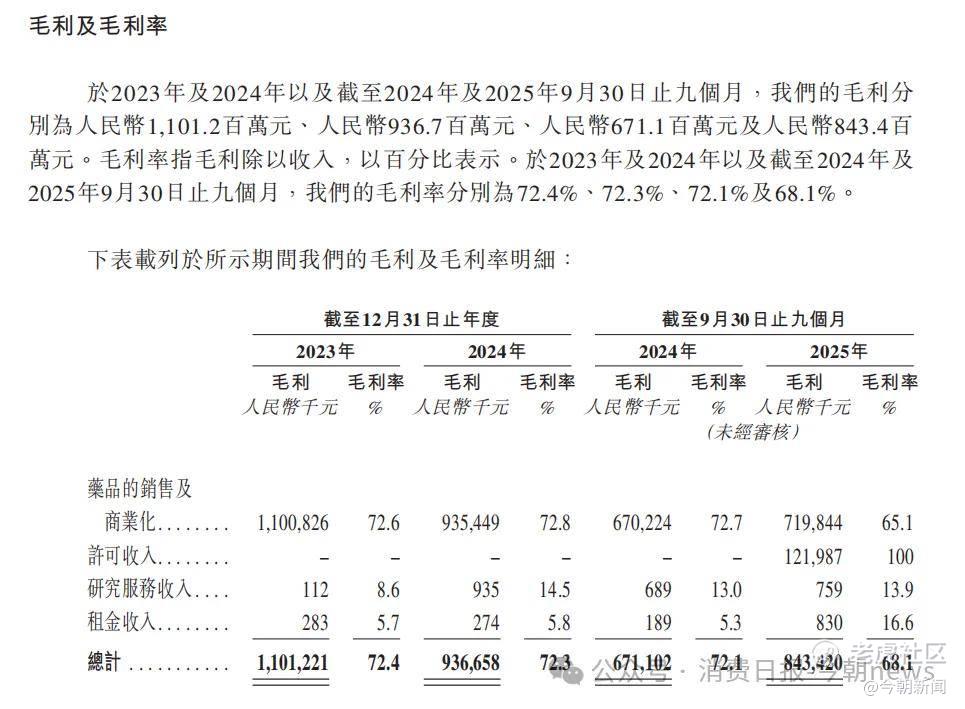 毛利率的逐年下滑进一步加剧盈利压力,2023-2025年前三季度公司毛利率分别为72.4%、72.3%、68.1%,连续两年下降。