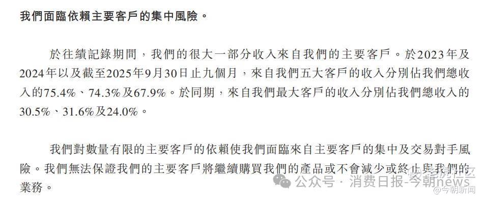 其产品与客户结构也存在隐忧,约九成收入依赖5款核心产品,前五大客户销售占比长期超60%。