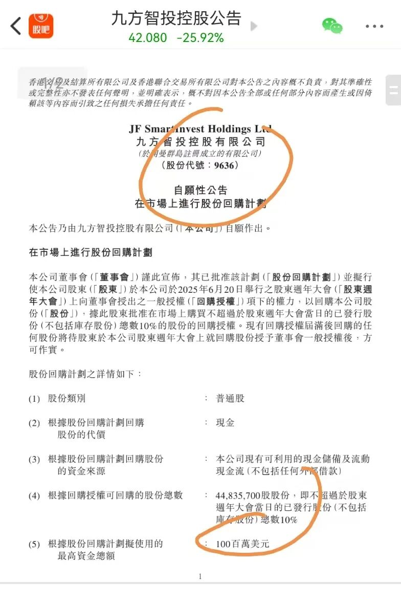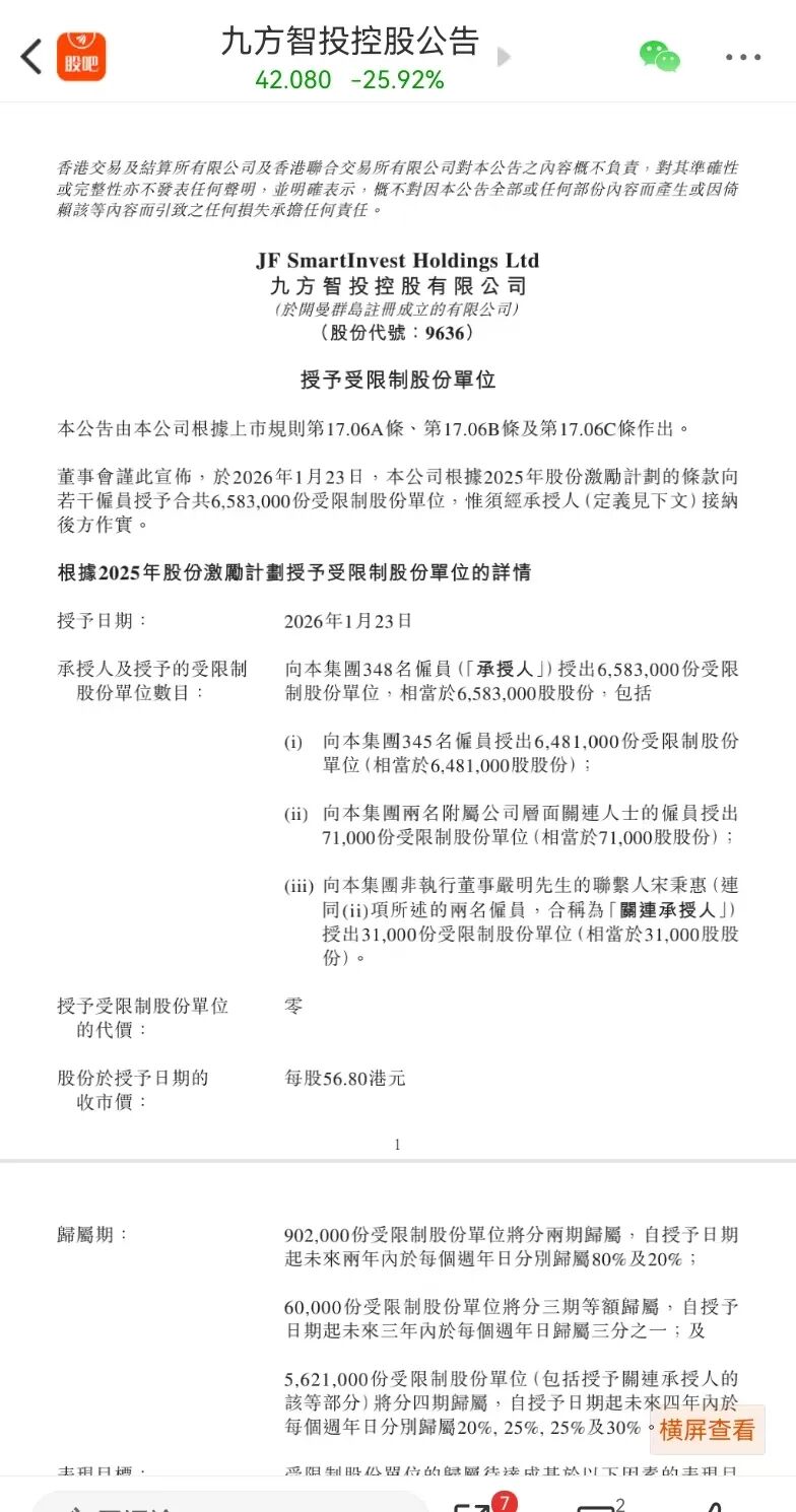 4 、直接导火索是市场对“员工激励计划”的误读与抛压。1月23日,公司公告:“根据2025年股份激励计划,向若干雇员授予 658.3万份受限制股份单位(RSUs)。”在股价已从高点 83.54港元 回撤近 50% 的背景下,市场情绪极度敏感,触发程序化交易止损 + 散户恐慌抛售。为稳定信心,九方智投昨天紧急宣布,启动不超过1亿美元的股票回购计划,按当时股价,可回购约2000万股,占总股本2.4%。