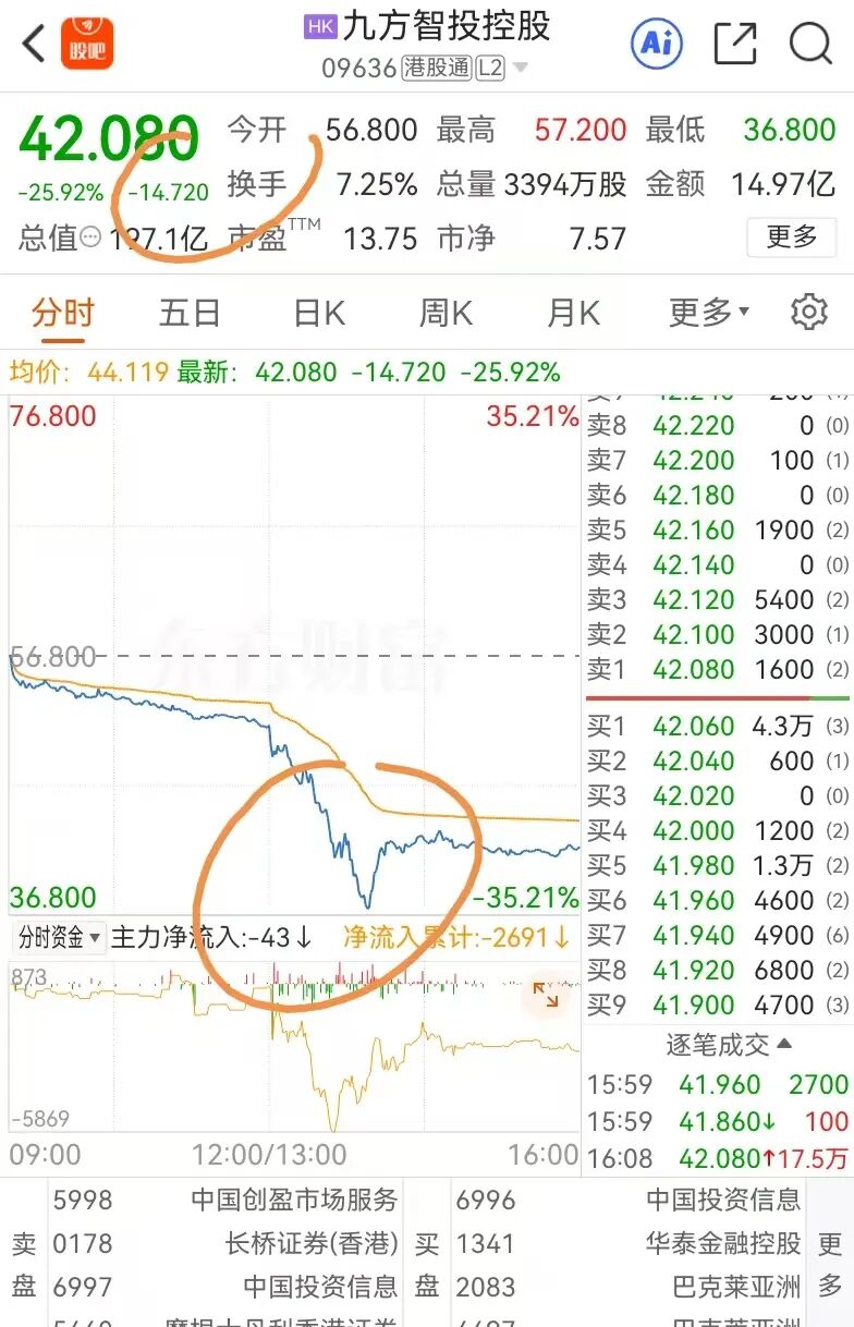 九方智投控股(09636.HK)在 2026年1月26日午后股价闪崩,盘中一度暴跌超35%,最终收跌约 26%–27%,成交额激增至 11.47亿港元(远高于平日)。