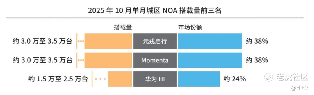 据《中国智能驾驶行业趋势白皮书(2025)》(下称“白皮书”),1 - 10月,Momenta、元戎启行、**HI位列城区NOA搭载量(第三方市场)前三名,分别为54%、23%和22%;其中,在10月的单月城区NOA搭载量中,元戎启行表现突出,位居行业第一。