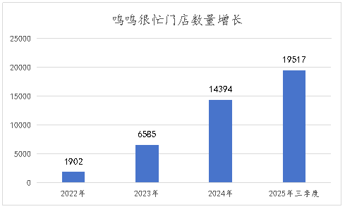 从加盟店数量看,2022年-2025年三季度,鸣鸣很忙门店数量从1902家增长到19517家。