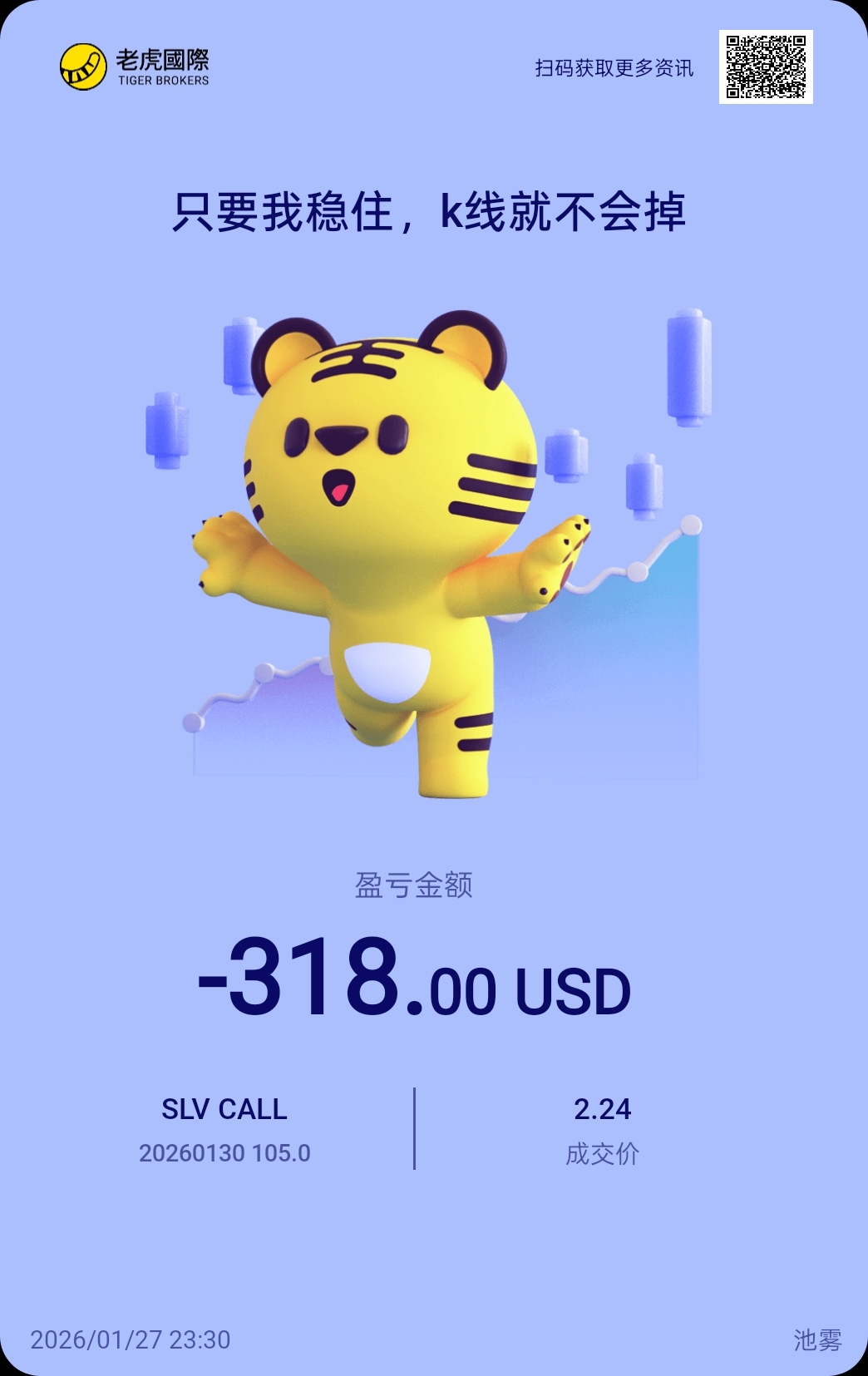$SLV 20260130 105.0 CALL$ 忍了好久,想小赚一笔,结果一进场就巨震。。。大户就盯着我这点小钱?$SLV 20260202 150.0 CALL$