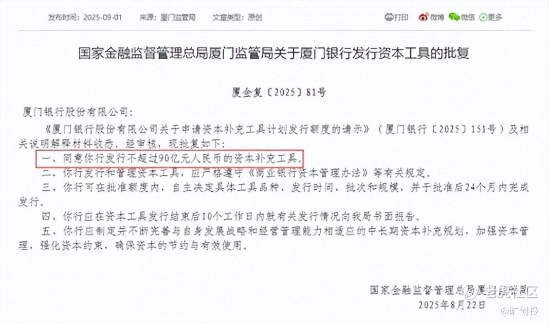 实际上,厦门银行急迫“补血”早在几个月前就有体现。旷投在国家金融监管总局官网看到,厦门监管局已经在2025年9月份同意厦门银行申请不超过90亿元的资本补充工具。这次19亿的永续债发行,也正是厦门银行进行外部资本补充的一个举措。