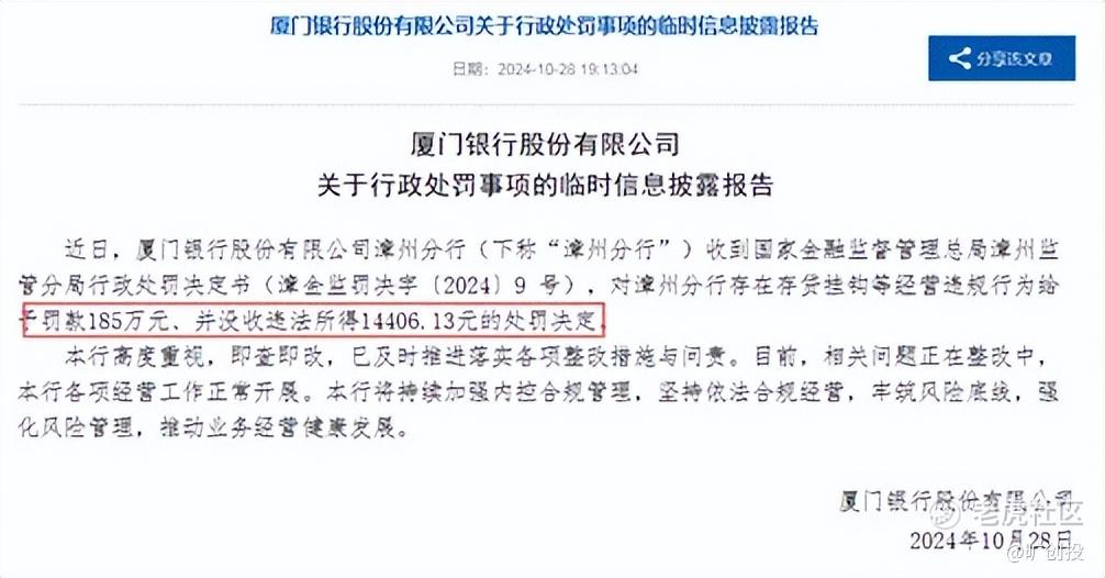 2024年10月,厦门银行漳州分行因存贷挂钩、违法向关系人发放信用贷款等6项违法违规行为,被合计处以罚款185万元。