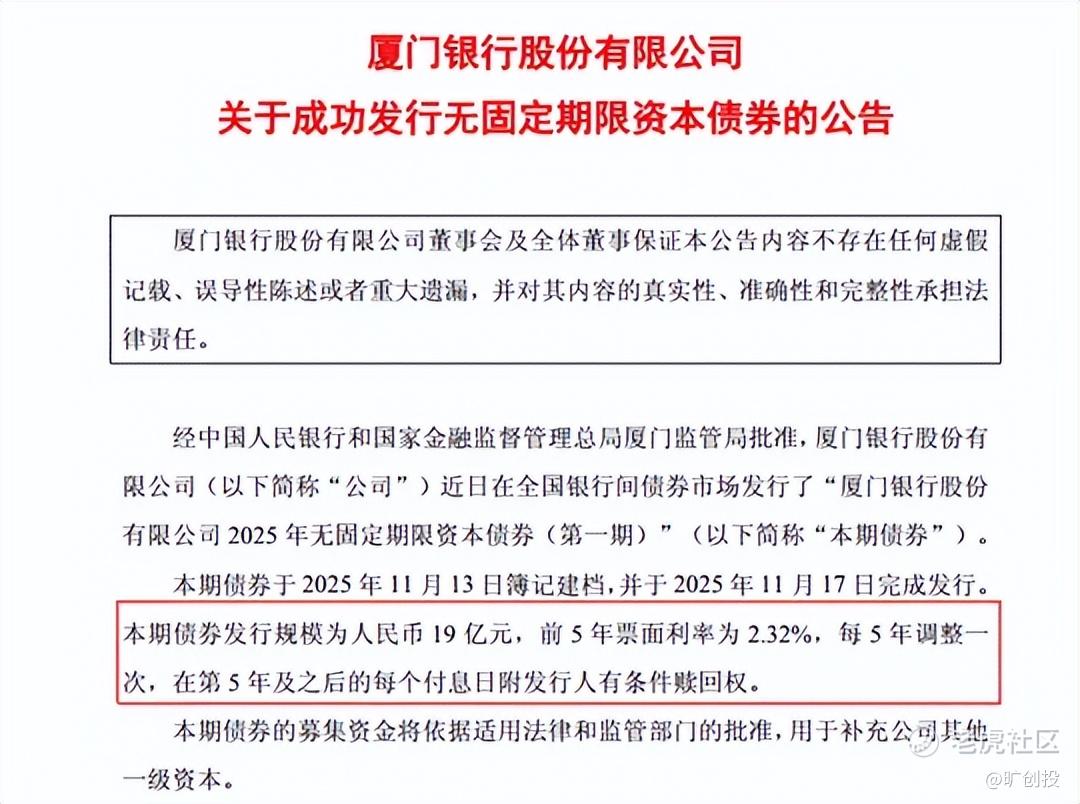 按照永续债第5年到期的惯例,厦门银行有10亿元的永续债于2025年12月到期。于是,在2025年11月,厦门银行成功发行了19亿元永续债,公告显示,本次资本债券前5年票面利率2.32%,每5年调整1次,第五年及之后每个付息日附有条件赎回权。