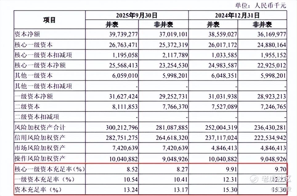 2024年,核心一级资本充足率、一级资本充足率、资本充足率分别为9.91%、12.31%、15.30%,而到2025年三季度,这三项充足率就降到了8.52%、10.54%、13.24%,各下降了0.39、1.77、1.06个百分点。