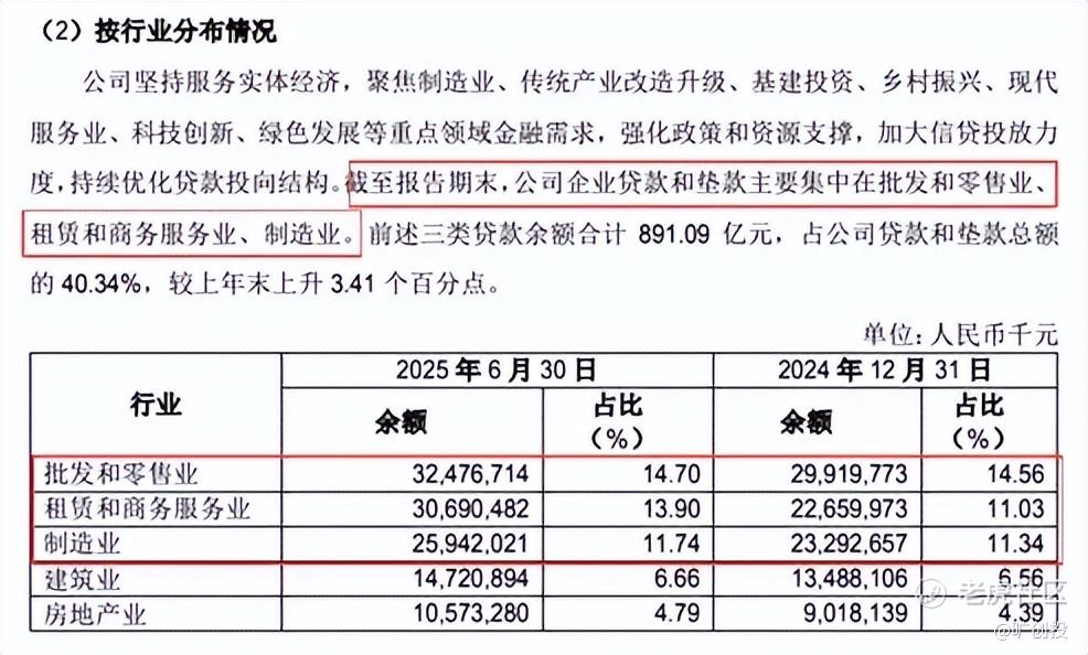 洪枇杷上任后,开始把更多贷款和垫款集中投向了批发和零售业、租赁和商务服务业、制造业等收益更高的领域。截止2025年6月底,这三类贷款余额加起来有将近900亿元,占贷款和垫款总额的40.34%,上升3.41个百分点。