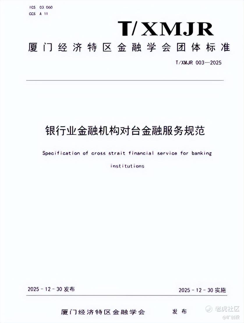 2025年底,在人民银行福建省分行和人民银行厦门市分行指导下,厦门经济特区金融学会发布金融团体标准,公布《银行业金融机构对台金融服务规范》。这是大陆银行发布的首个对台近金融服务的团体标准。