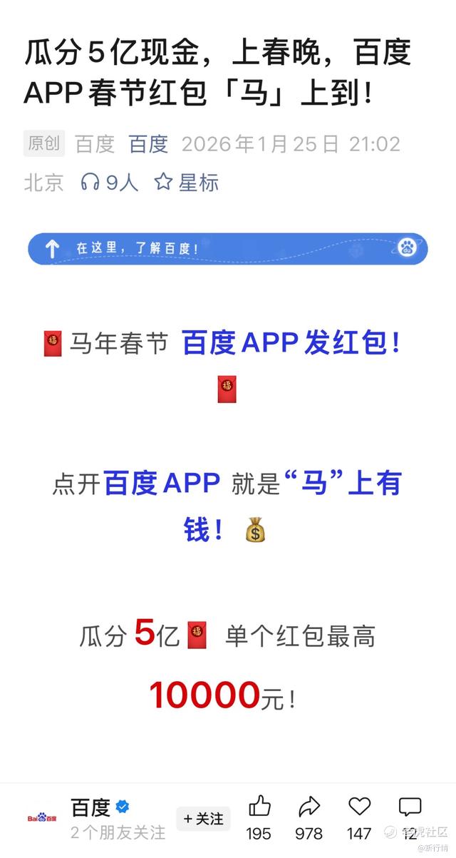春节将至,百度启动了5亿元现金红包和春晚首席AI合作伙伴的营销组合拳,试图通过国民级流量入口积累用户。
