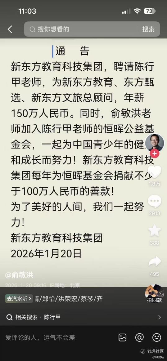 另一边是,俞敏洪发布通告称“新东方教育科技集团,聘请陈行甲老师,为新东方教育、东方甄选、新东方文旅总顾问,年薪150万人民币。”这一通告引发争议,有网友称如果没有后面的年薪,这还算是一则正常通告,很少有类似通告中直接通报年薪的。特别是陈行甲一直从事的是公益事业,而此次陈行甲担任新东方顾问也是为了公益事业。
