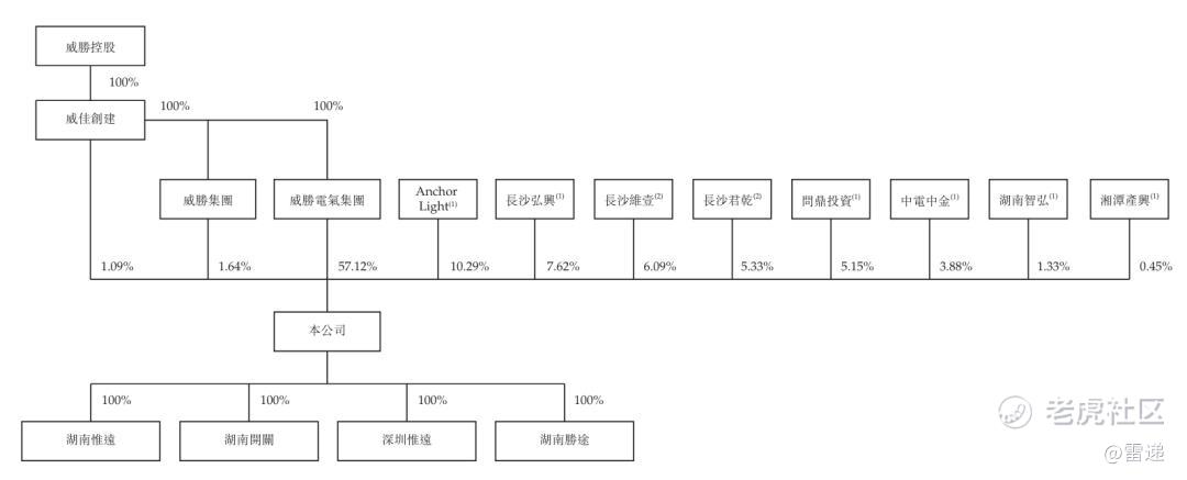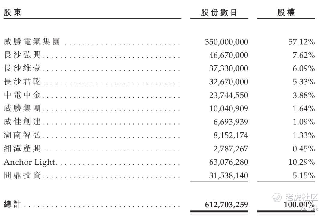 IPO前,威胜电气集团持股为57.12%,威胜集团持股为1.64%,威佳创建持股为1.09%,Anchor Light持股为10.29%,长沙弘兴持股为7.62%,长沙维壹持股为6.09%;