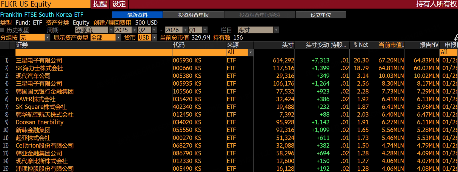 $Franklin FTSE South Korea ETF(FLKR)$ :规模3亿美元,流动性稍差,但管理费最低,只有0.09%,远低于EWY的0.59%。持仓较ewy分散: