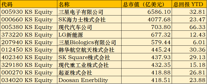 在韩国股市中,三星电子和SK海力士的总市值超过1万亿美元,占韩国股市总市值的33%: