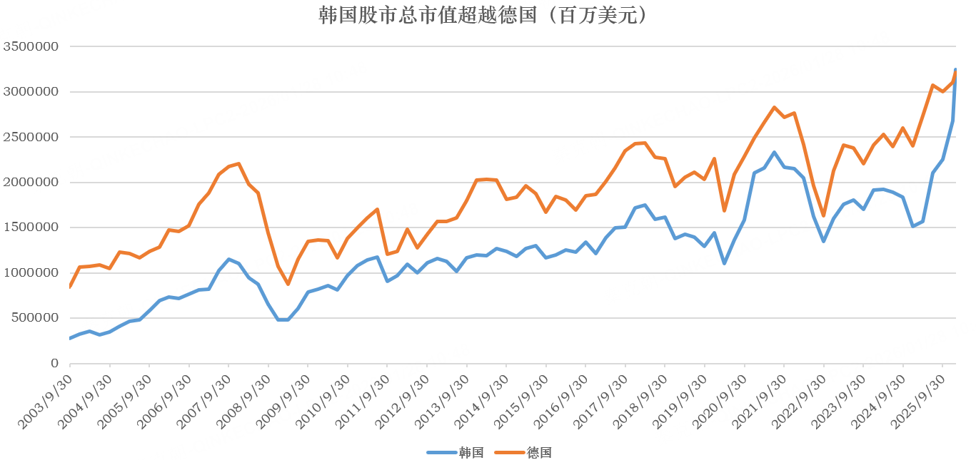 昨日,韩国股市总市值达到3.25万亿美元,超越德国的3.22万亿,成为全球第10大股票市场!