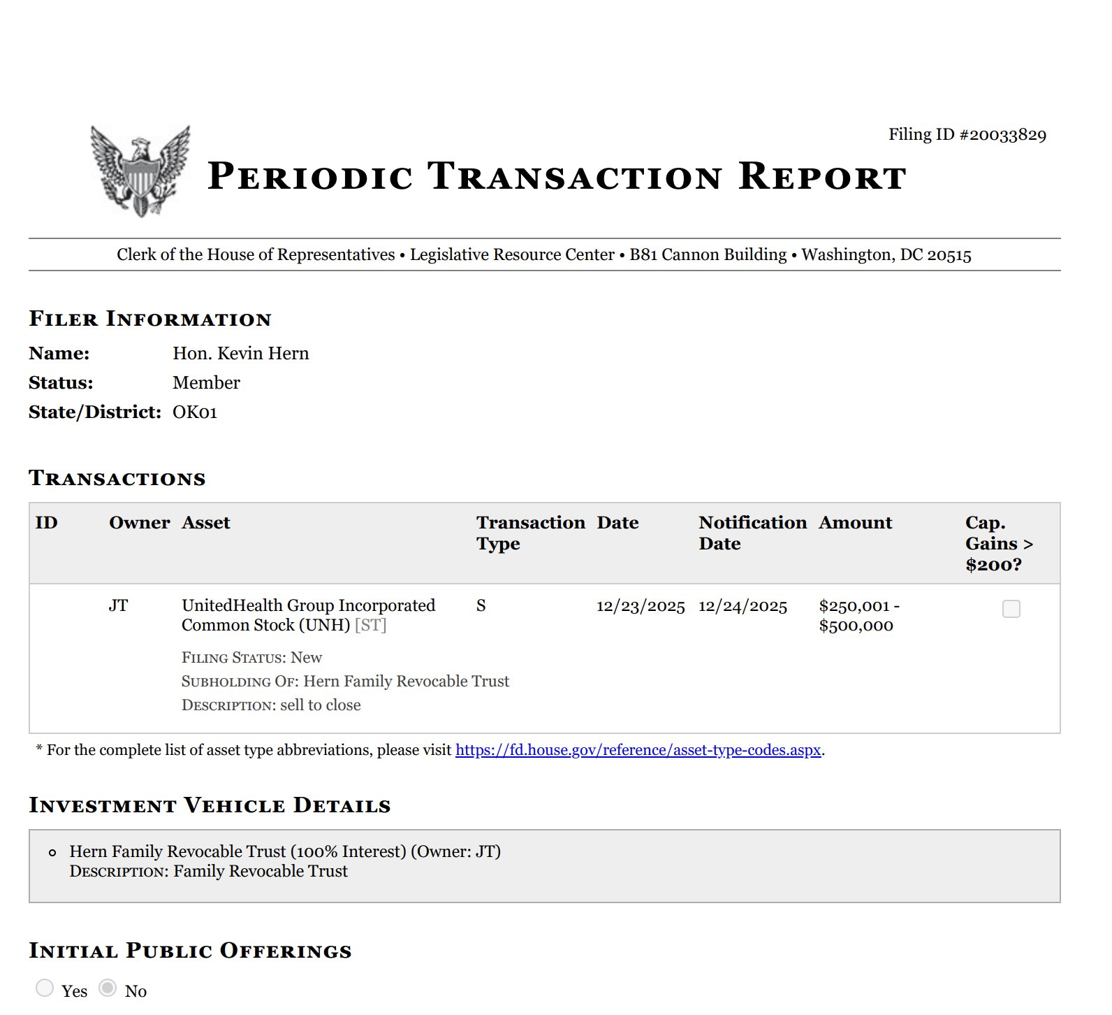 再看一些“股神”的交易,美国众议院议员Kevin Hern披露了个人交易:25年年底卖出了全部持有的UNH股票。(此人拥有卫生税务小组委员会席位,该委员会在医保支付、MA等政策上拥有立法和监督权)