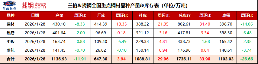 兰格钢铁网&找钢网 全国重点钢材品种产量&库存表(2026.1.28)