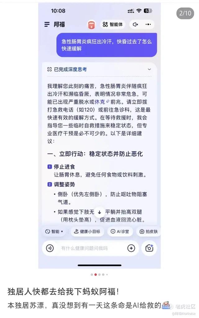 这些也为阿福的「炸场」积蓄了底气。不同于通用AI助手只提供基本的健康问答,蚂蚁的策略是让就医需求的用户从挂号、在线问诊到线下就医,都能通过阿福搞定;先立住「医疗专业性」,然后再向健康管理与日常陪伴延伸。